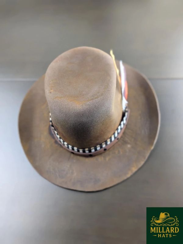 Crafted from premium distressed wool felt, The Outrider’s finish is intentionally rugged, giving it a lived-in look straight out of a prairie dust storm. A checkered band and feather detail add just enough edge—like a warning shot before the storm rolls in.